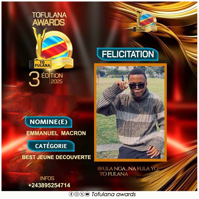 TOFULANA AWARDS (Une structure qui socioculturelle qui prime les valeurs) :Téléphone : +243819295977 E-mail : samuelndjoli05@gmail.com