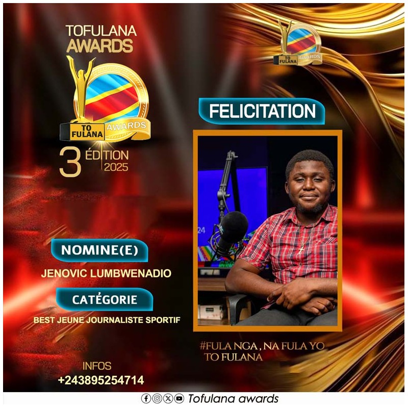 TOFULANA AWARDS 3ème édition/025 NOMINE JENOVIC LUMBWENADIO : BEST JEUNE JOURNALISTE SPORTIF