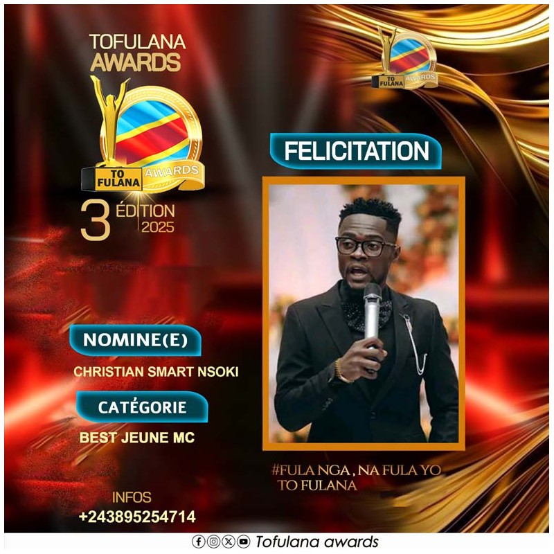 TOFULANA AWARDS (Une structure qui socioculturelle qui prime les valeurs) :Téléphone : +243819295977 E-mail : samuelndjoli05@gmail.com