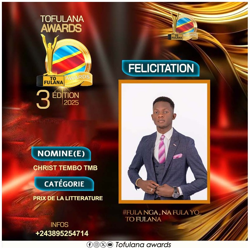 TOFULANA AWARDS (Une structure qui socioculturelle qui prime les valeurs) :Téléphone : +243819295977 E-mail : samuelndjoli05@gmail.com