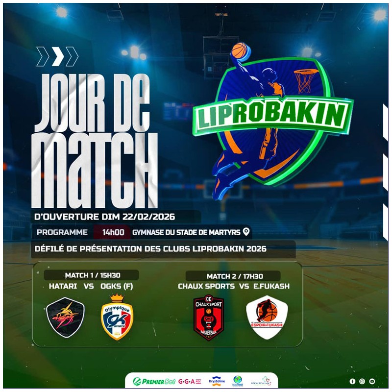 Dim, le 22/02/2026 à partir de 14h00, 1ère Journée LIPROBAKIN éd. 61 au GYMNASE JUMELE du Stade de Martyrs/Kinshasa. A partir de 14h00.