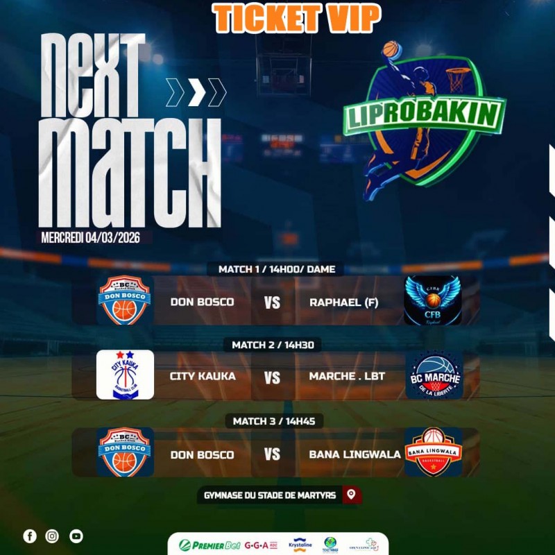 Merc, le 04/03/2026 à partir de 13h30, LIPROBAKIN éd. 61 au GYMNASE du Stade de Martyrs/Kinshasa. A partir de 14h00. Contact Organisation : +24382 83 02 505. CHOISISSEZ LA CATEGORIE DE TICKET
