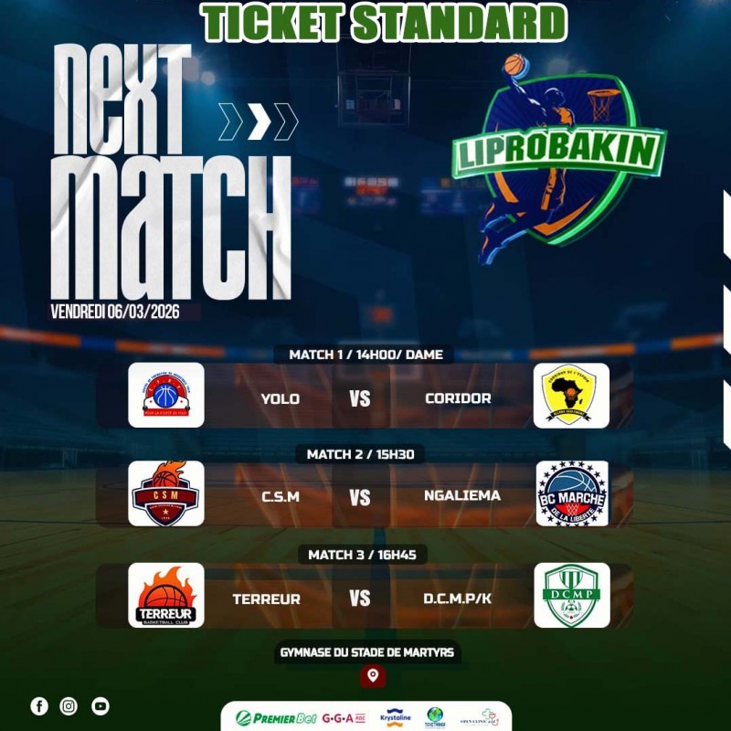 Vendredi, 06/03/026/Ticket Standard : de la 61ème édition du CHAMPIONNAT LIPROBAKIN. Ticket 3.000Fc. Lieu : Gymnase du Stade de Martyrs/Kinshasa. A partir de 14h00. Contact Organisation : +24382 83 02 505