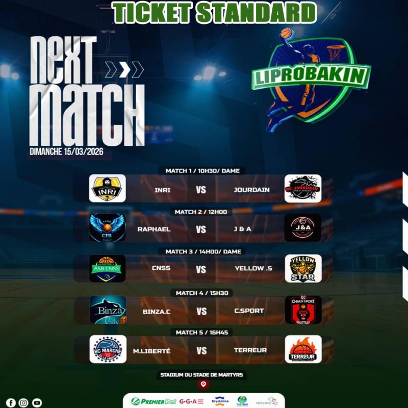 Dim, 15/03/026/Ticket Standard : de la 61ème édition du CHAMPIONNAT LIPROBAKIN. Ticket 3.000Fc. Lieu : Stadium du Stade de Martyrs/Kinshasa. A partir de 12h00. Contact Organisation : +24382 83 02 505