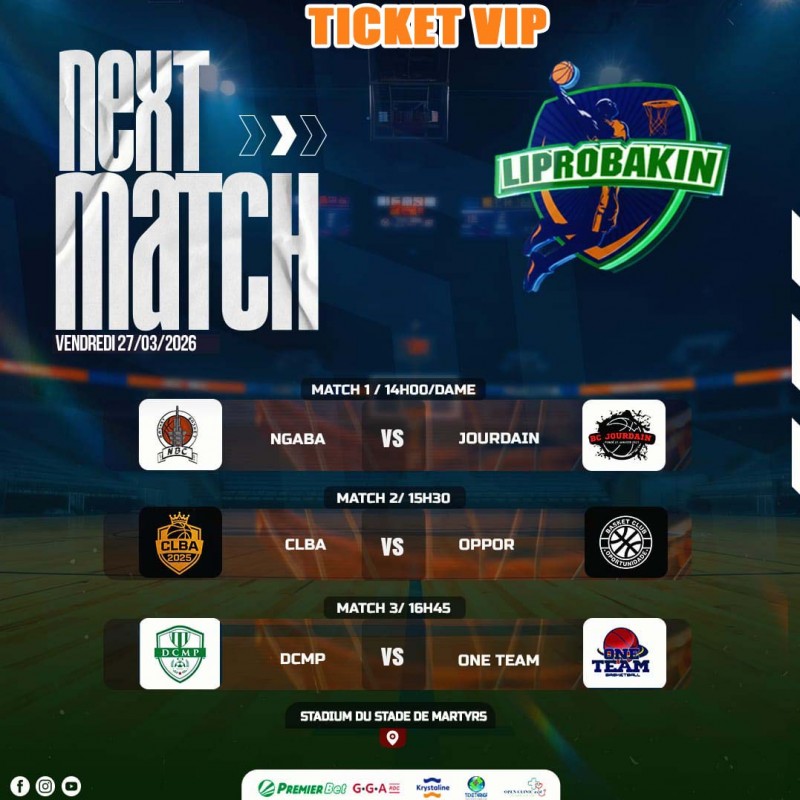 Vendredi, 27/03/026/Ticket VIP : de la 61ème édition du CHAMPIONNAT LIPROBAKIN. Ticket 10$. Lieu : Stadium du Stade de Martyrs/Kinshasa. A partir de 14h00. Contact Organisation : +24382 83 02 505