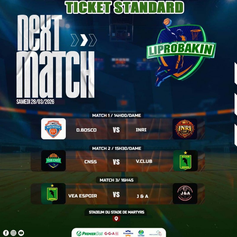 Samedi, 28/03/026/Ticket Standard : de la 61ème édition du CHAMPIONNAT LIPROBAKIN. Ticket 3.000Fc. Lieu : Stadium du Stade de Martyrs/Kinshasa. A partir de 14h00. Contact Organisation : +24382 83 02 505
