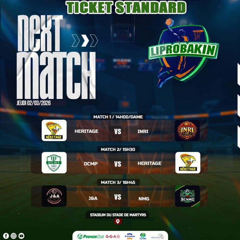 Jeudi, 02/04/026/Ticket Standard : de la 61ème édition du CHAMPIONNAT LIPROBAKIN. Ticket 3.000Fc. Lieu : Stadium du Stade de Martyrs/Kinshasa. A partir de 14h00. Contact Organisation : +24382 83 02 505