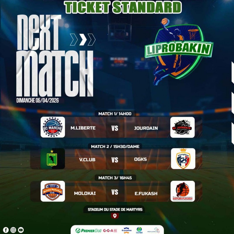 Dimanche, 05/04/026/Ticket Standard : de la 61ème édition du CHAMPIONNAT LIPROBAKIN. Ticket 3.000Fc. Lieu : Stadium du Stade de Martyrs/Kinshasa. A partir de 14h00. Contact Organisation : +24382 83 02 505