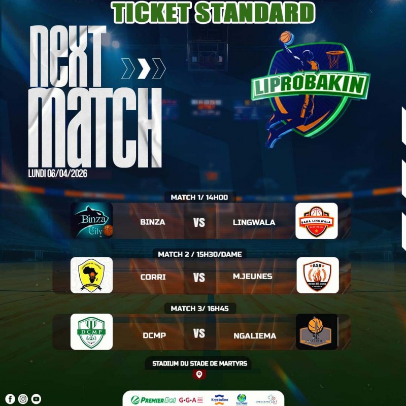 Lundi, 06/04/026/Ticket Standard : de la 61ème édition du CHAMPIONNAT LIPROBAKIN. Ticket 3.000Fc. Lieu : Stadium du Stade de Martyrs/Kinshasa. A partir de 14h00. Contact Organisation : +24382 83 02 505