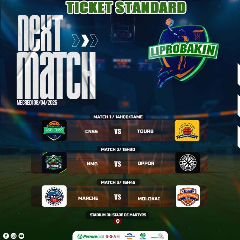 Mercredi, 08/04/026/Ticket Standard : de la 61ème édition du CHAMPIONNAT LIPROBAKIN. Ticket 3.000Fc. Lieu : Stadium du Stade de Martyrs/Kinshasa. A partir de 14h00. Contact Organisation : +24382 83 02 505