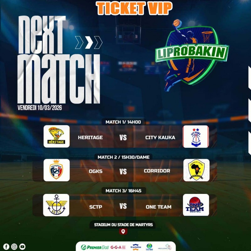 Vendredi, 10/04/026/Ticket VIP : de la 61ème édition du CHAMPIONNAT LIPROBAKIN. Ticket 10$. Lieu : Stadium du Stade de Martyrs/Kinshasa. A partir de 14h00. Contact Organisation : +24382 83 02 505