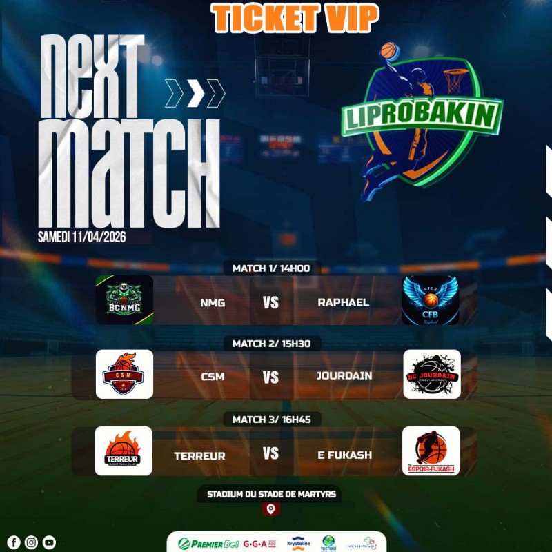 Samedi, 11/04/026/Ticket VIP : de la 61ème édition du CHAMPIONNAT LIPROBAKIN. Ticket 10$. Lieu : Stadium du Stade de Martyrs/Kinshasa. A partir de 14h00. Contact Organisation : +24382 83 02 505