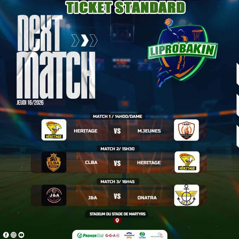 Jeudi, 16/04/026/Ticket Standard : de la 61ème édition du CHAMPIONNAT LIPROBAKIN. Ticket 3.000Fc. Lieu : Stadium du Stade de Martyrs/Kinshasa. A partir de 14h00. Contact Organisation : +24382 83 02 505