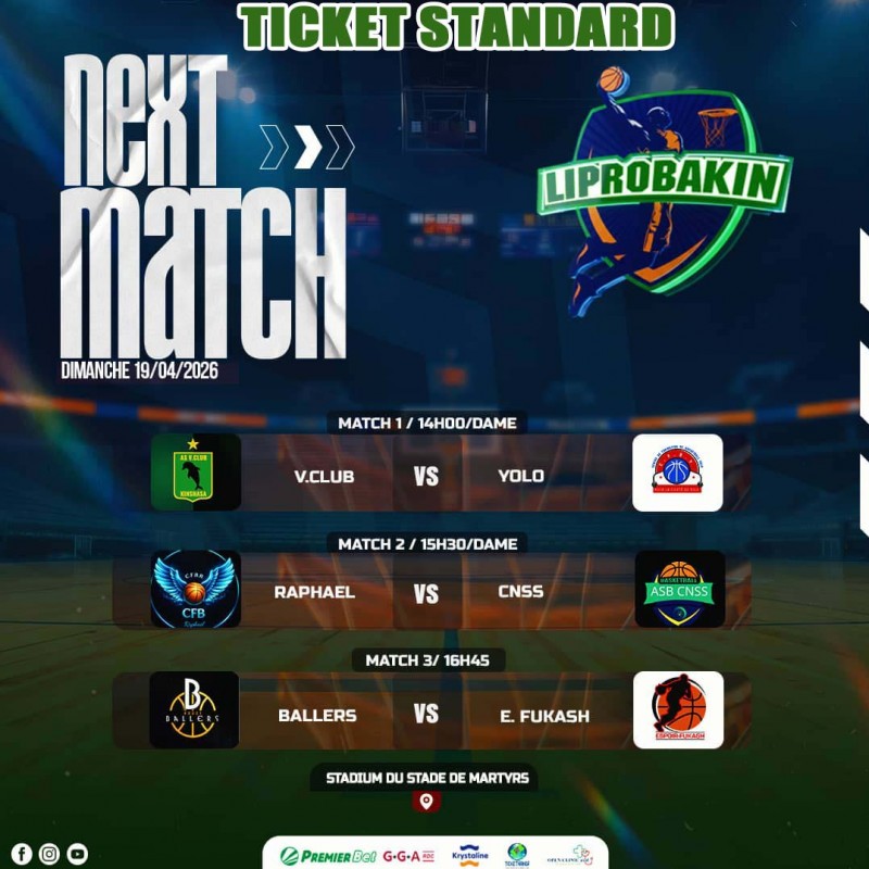 Dimanche, 19/04/026/Ticket Standard : de la 61ème édition du CHAMPIONNAT LIPROBAKIN. Ticket 3.000Fc. Lieu : Stadium du Stade de Martyrs/Kinshasa. A partir de 14h00. Contact Organisation : +24382 83 02 505