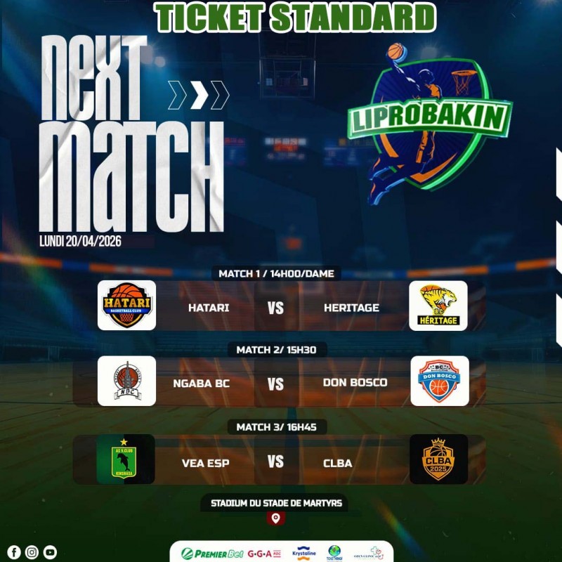 Lundi, 20/04/026/Ticket Standard : de la 61ème édition du CHAMPIONNAT LIPROBAKIN. Ticket 3.000Fc. Lieu : Stadium du Stade de Martyrs/Kinshasa. A partir de 14h00. Contact Organisation : +24382 83 02 505