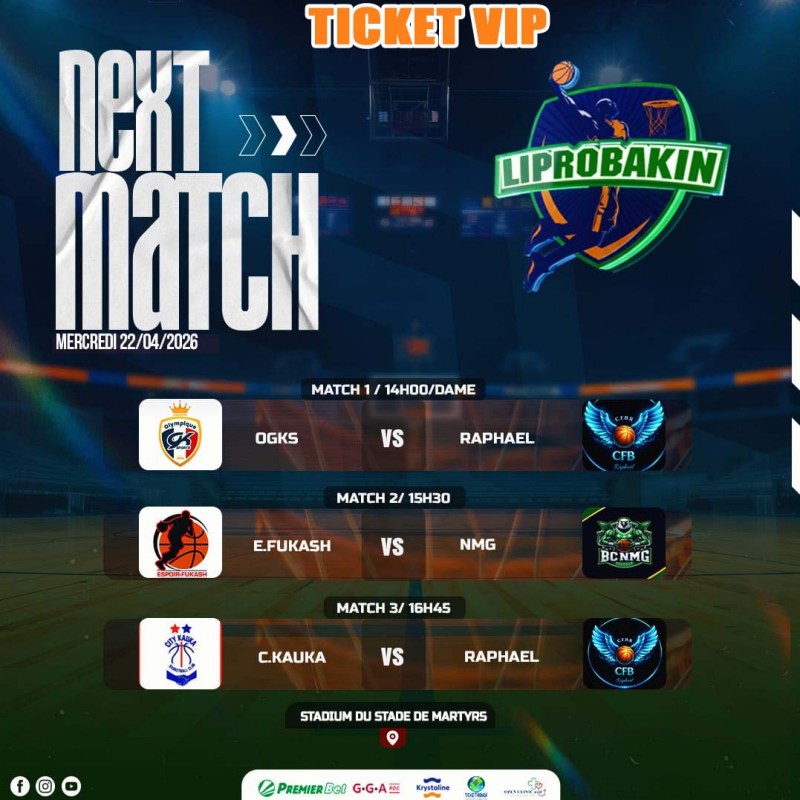 Mercredi, 22/04/026/Ticket VIP : de la 61ème édition du CHAMPIONNAT LIPROBAKIN. Ticket 10$. Lieu : Stadium du Stade de Martyrs/Kinshasa. A partir de 14h00. Contact Organisation : +24382 83 02 505