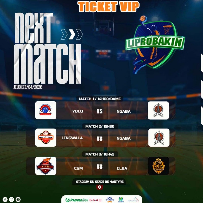 Jeudi, 23/04/026/Ticket VIP : de la 61ème édition du CHAMPIONNAT LIPROBAKIN. Ticket 10$. Lieu : Stadium du Stade de Martyrs/Kinshasa. A partir de 14h00. Contact Organisation : +24382 83 02 505