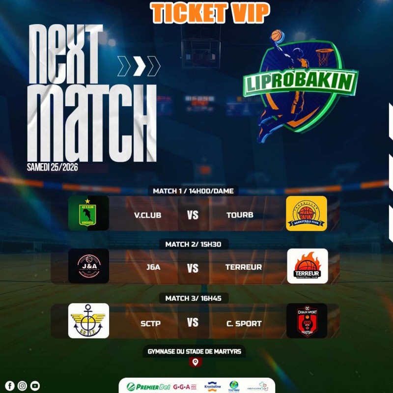 Samedi, 25/04/026/Ticket VIP : de la 61ème édition du CHAMPIONNAT LIPROBAKIN. Ticket 10$. Lieu : Gymnase du Stade de Martyrs/Kinshasa. A partir de 14h00. Contact Organisation : +24382 83 02 505