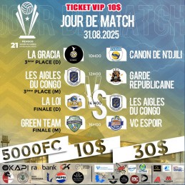 Dimanche, 31/08/025/Ticket VIP FINALE 10$ : Volleyball/21ème édition de la Coupe du Congo. Lieu : Gymnase de la PNC/Kinshasa. A partir de 12h00.