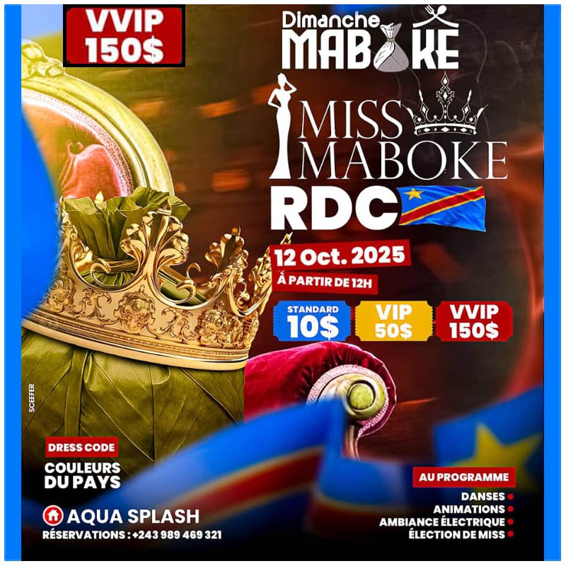 Dimanche, 12/10/025, Dimanche Maboke est un évènement culturel qui présente les richesses culturelles de la RDC et qui se tiendra tous les Dimanches à partir du dimanche 12 octobre. Ticket VVIP 150$