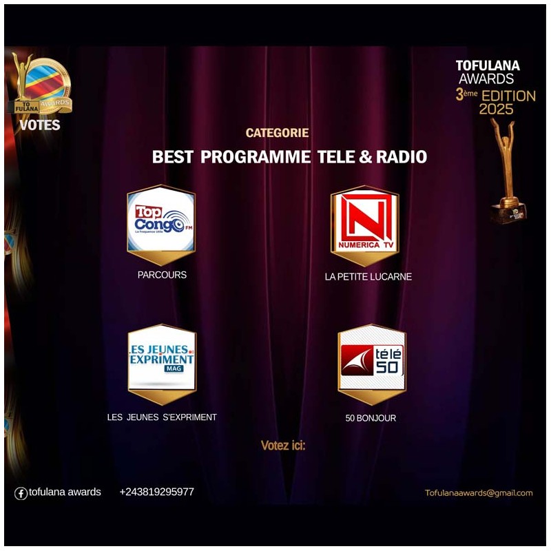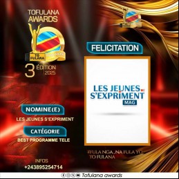 TOFULANA AWARDS (Une structure qui socioculturelle qui prime les valeurs) :Téléphone : +243819295977  E-mail : samuelndjoli05@gmail.com